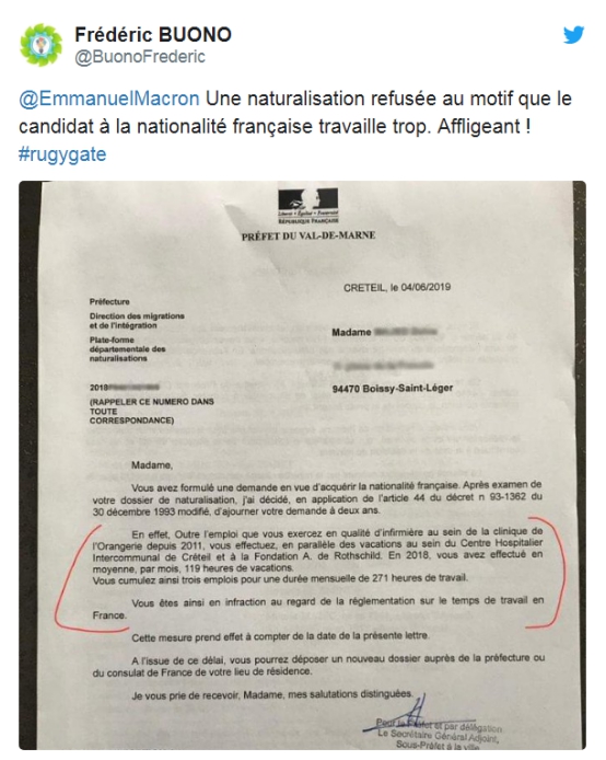 《每日邮报》称,这名女护士的朋友对这一事件感到震惊,在推特分享了这封拒绝信,并发文写道:“入籍申请遭到拒绝,理由是申请法国国籍的候选人工作太努力了。”↓