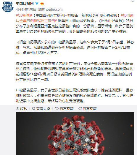 《旧金山记事报》公布的尸检报告显示,这名57岁女子于2月6日去世,其心脏、气管、肺部和肠道都存在新冠病毒感染。这份尸检报告早在2月7日完成,但直到4月23日才签字。